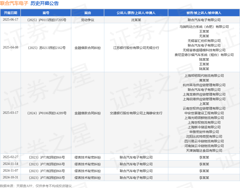 案号:(2025)沪0115民初37205号审理法院:上海市浦东新区人民法院案由:劳动争议当事人信息: 原告/上诉人:沈某某 被告/被上诉人:联合汽车电子有限公司开庭日期:2025年6月17日根据统计,近一年内以联合汽车电子有限公司为当事人的历史开庭公告有7则,其中案由为“侵害技术秘密纠纷”的公告以4则居首,其次为“金融借款合同纠纷”有2则,“劳动争议”有1则。历史开庭公告如下: